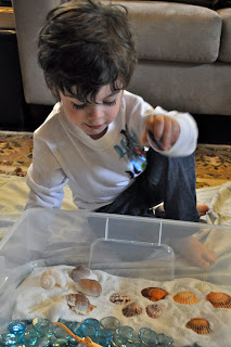 Monkey J loved filling up his hermit crab shell with sand and pretending the "hermit crab" was asleep inside the sand: